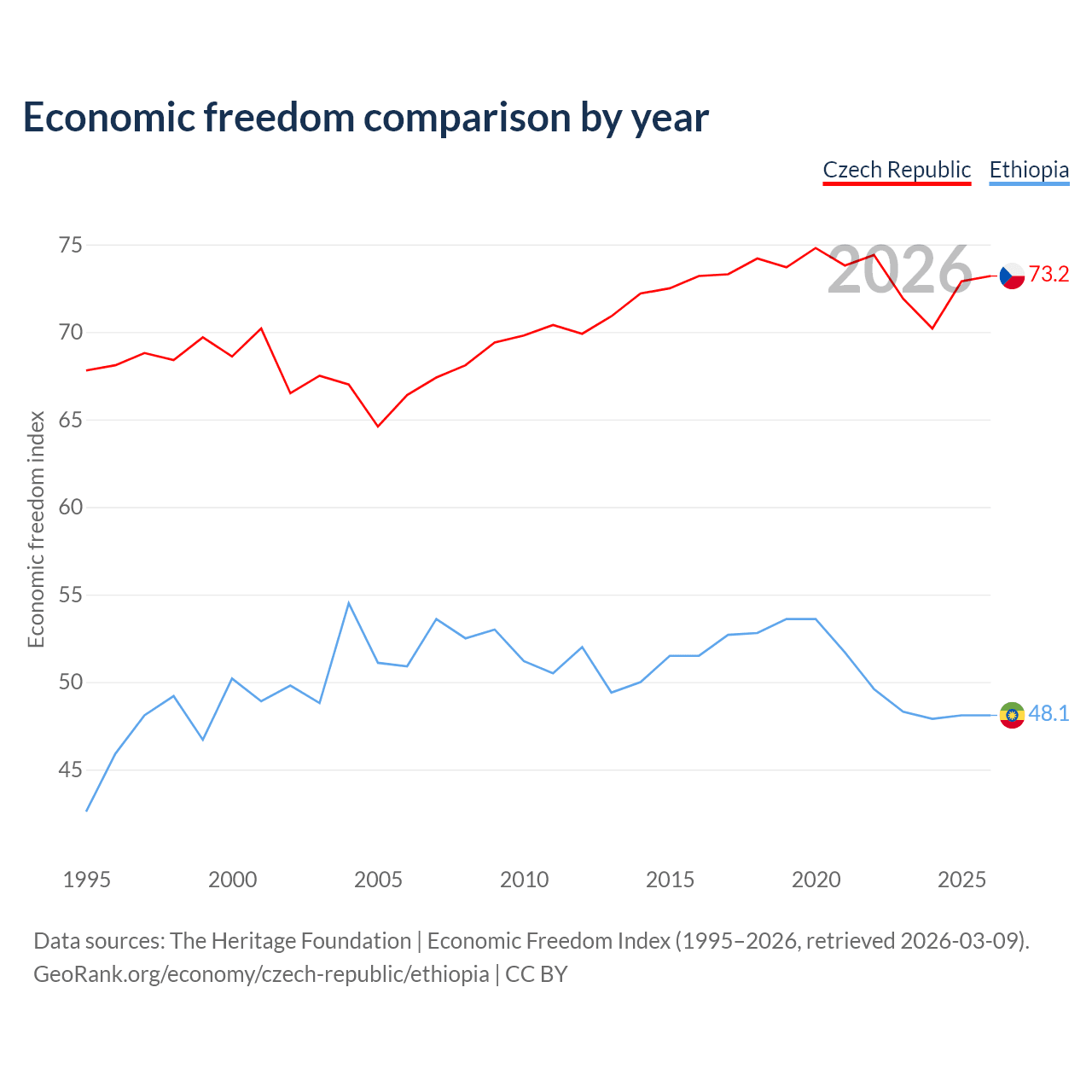 The Economic Freedom Index for the Czech Republic is 73.2, ranking 25/197, compared to 48.1 for Ethiopia, ranking 171/197. The chart above displays a comparison of annual changes in economic freedom indexes.