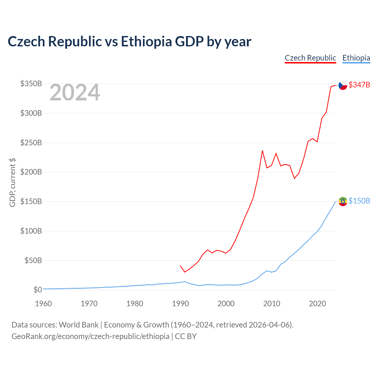 The Czech Republic has a GDP of $347B compared to $150B for Ethiopia, ranking 44/197 and 60/197 by economy size, respectively.