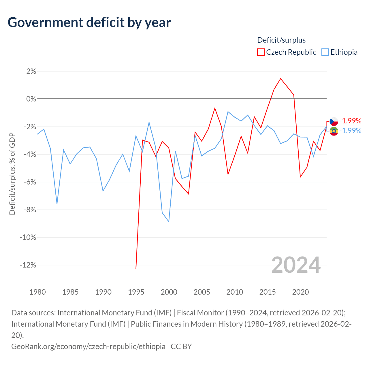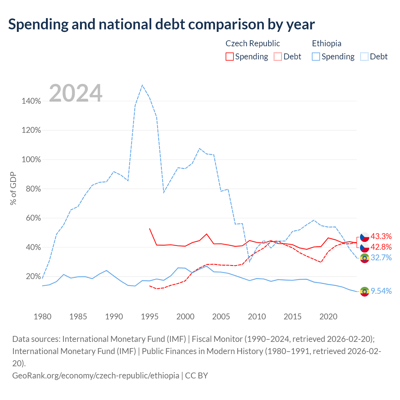 The Czech Republic has $150B in government debt (43.3% of GDP), compared to $48.9B (32.7% of GDP) in Ethiopia.