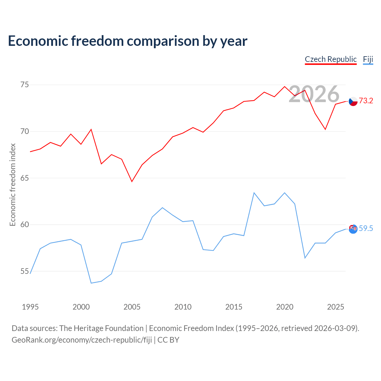 The Economic Freedom Index for the Czech Republic is 73.2, ranking 25/197, compared to 59.5 for Fiji, ranking 103/197. The chart above displays a comparison of annual changes in economic freedom indexes.