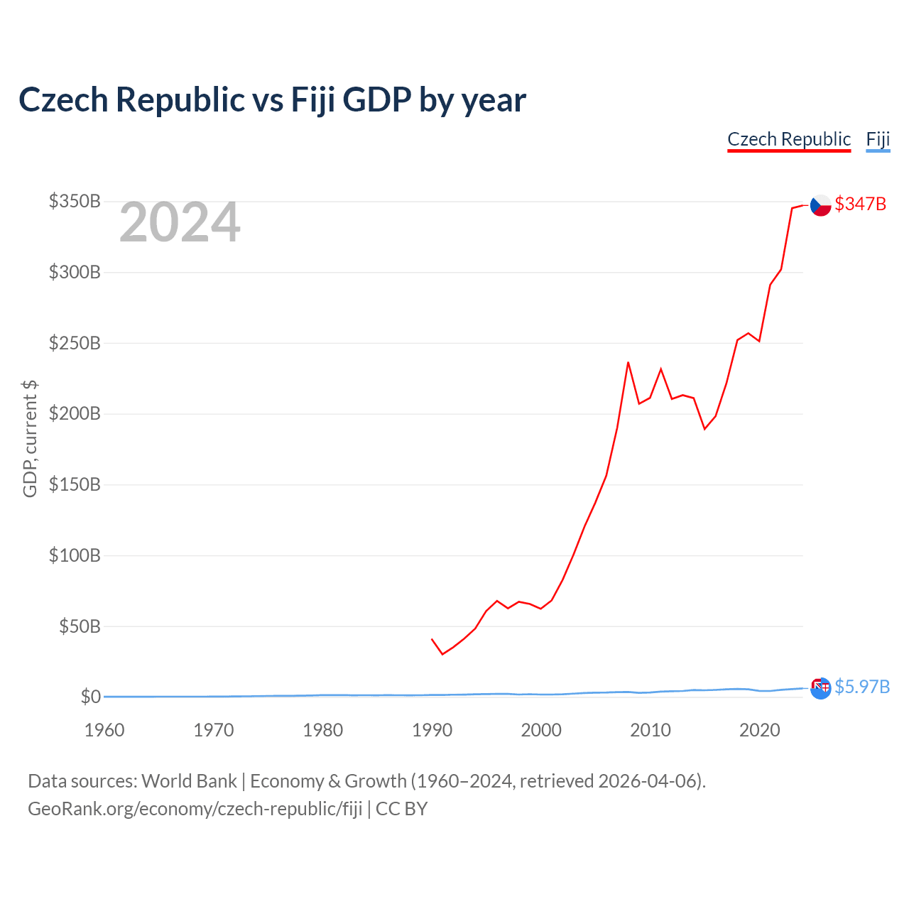 The Czech Republic has a GDP of $347B compared to $5.97B for Fiji, ranking 44/197 and 161/197 by economy size, respectively.
