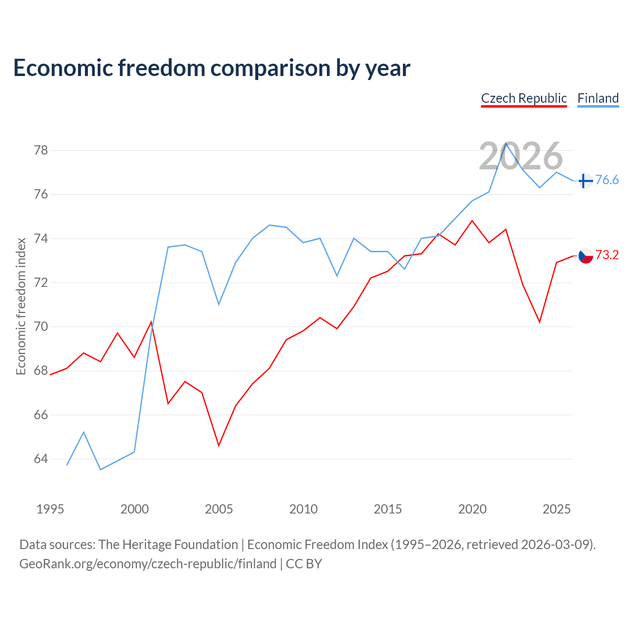 The Economic Freedom Index for the Czech Republic is 73.2, ranking 25/197, compared to 76.6 for Finland, ranking 15/197. The chart above displays a comparison of annual changes in economic freedom indexes.