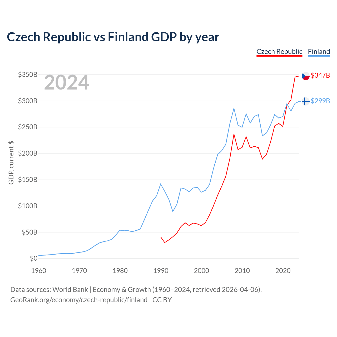 The Czech Republic has a GDP of $347B compared to $299B for Finland, ranking 44/197 and 47/197 by economy size, respectively.
