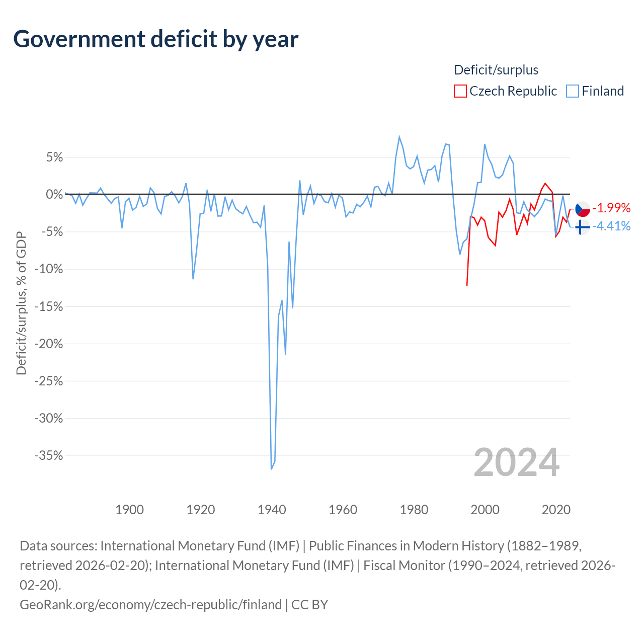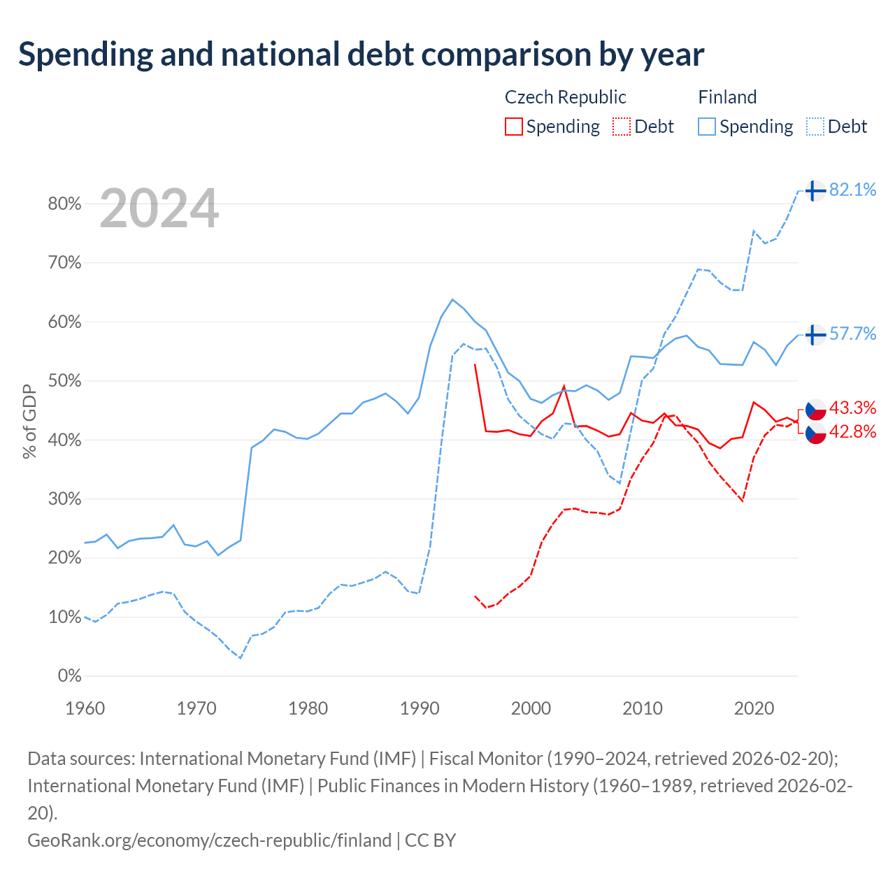 The Czech Republic has $150B in government debt (43.3% of GDP), compared to $245B (82.1% of GDP) in Finland.