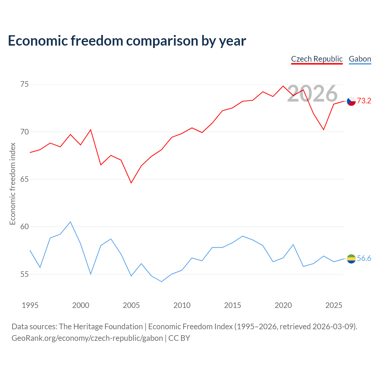 The Economic Freedom Index for the Czech Republic is 73.2, ranking 25/197, compared to 56.6 for Gabon, ranking 120/197. The chart above displays a comparison of annual changes in economic freedom indexes.
