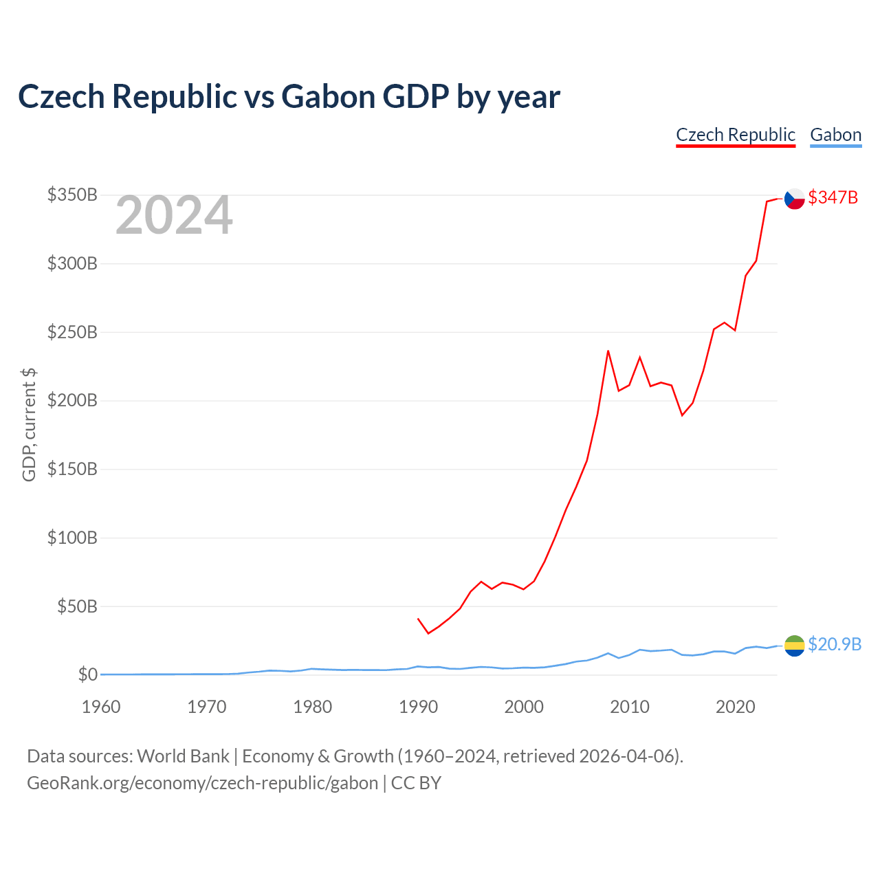 The Czech Republic has a GDP of $347B compared to $20.9B for Gabon, ranking 44/197 and 127/197 by economy size, respectively.