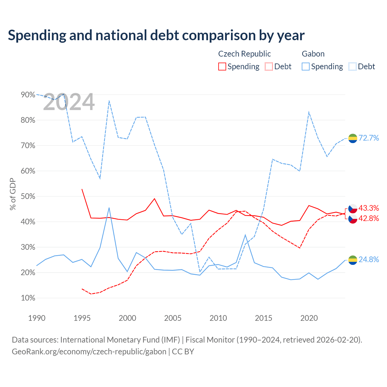 The Czech Republic has $150B in government debt (43.3% of GDP), compared to $15.2B (72.7% of GDP) in Gabon.