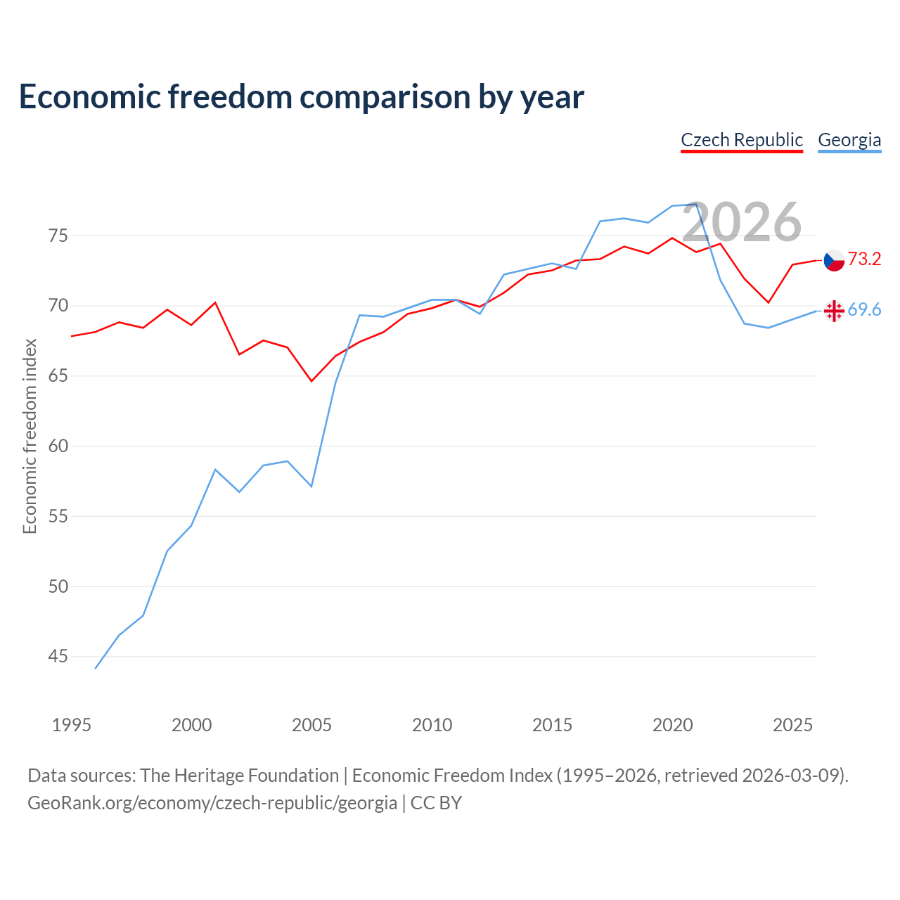 The Economic Freedom Index for the Czech Republic is 73.2, ranking 25/197, compared to 69.6 for Georgia, ranking 41/197. The chart above displays a comparison of annual changes in economic freedom indexes.
