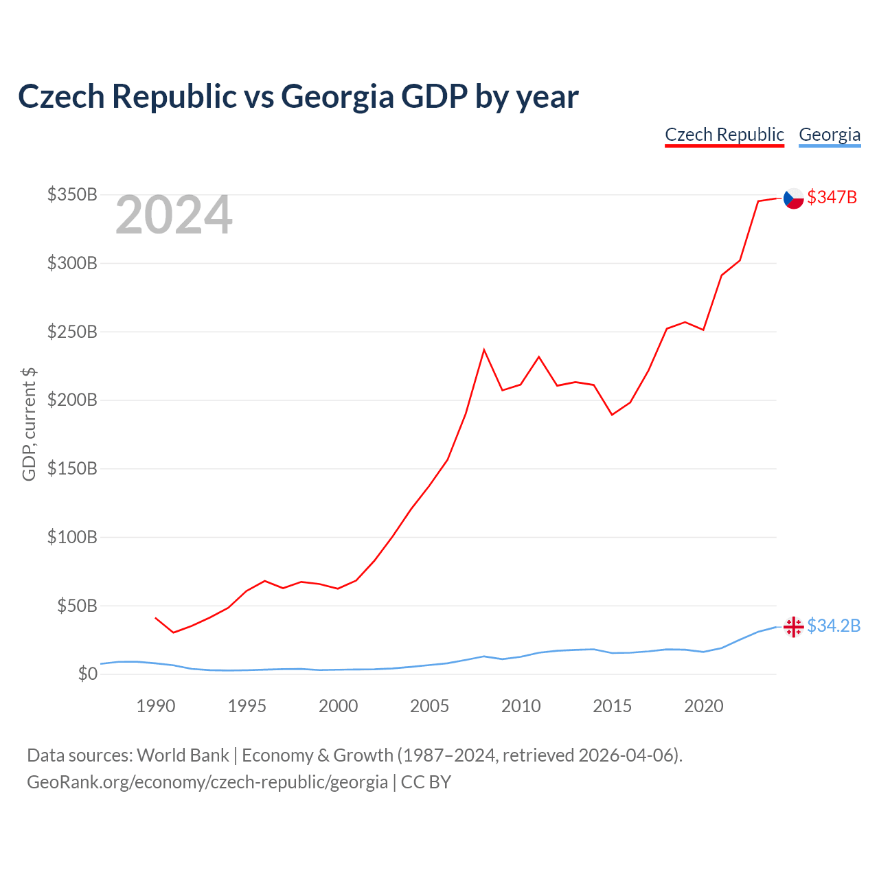 The Czech Republic has a GDP of $347B compared to $34.2B for Georgia, ranking 44/197 and 107/197 by economy size, respectively.