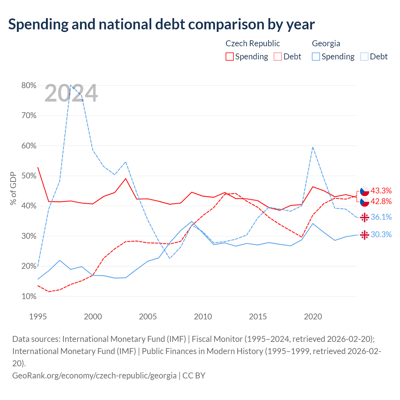 The Czech Republic has $150B in government debt (43.3% of GDP), compared to $12.3B (36.1% of GDP) in Georgia.