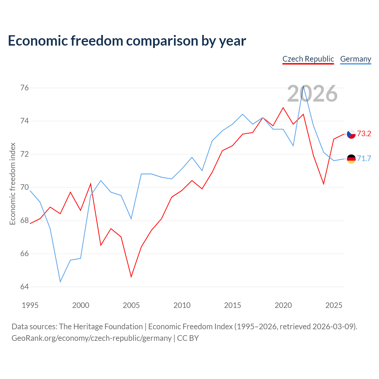The Economic Freedom Index for the Czech Republic is 73.2, ranking 25/197, compared to 71.7 for Germany, ranking 30/197. The chart above displays a comparison of annual changes in economic freedom indexes.