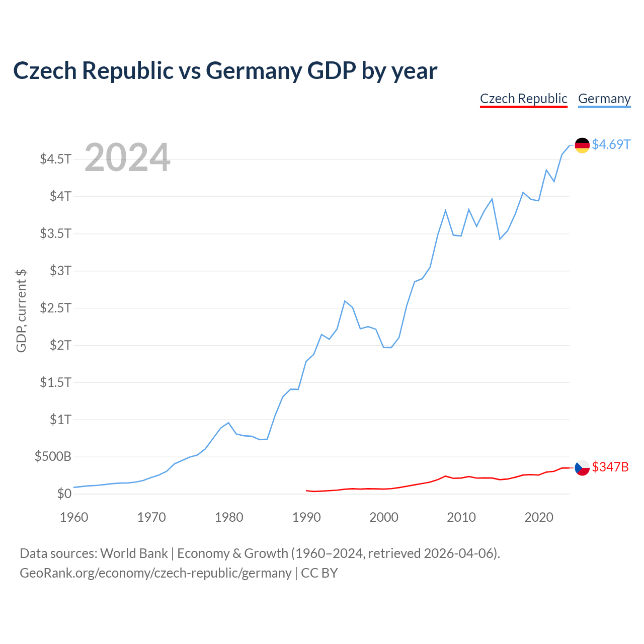 The Czech Republic has a GDP of $347B compared to $4.69T for Germany, ranking 44/197 and 3/197 by economy size, respectively.