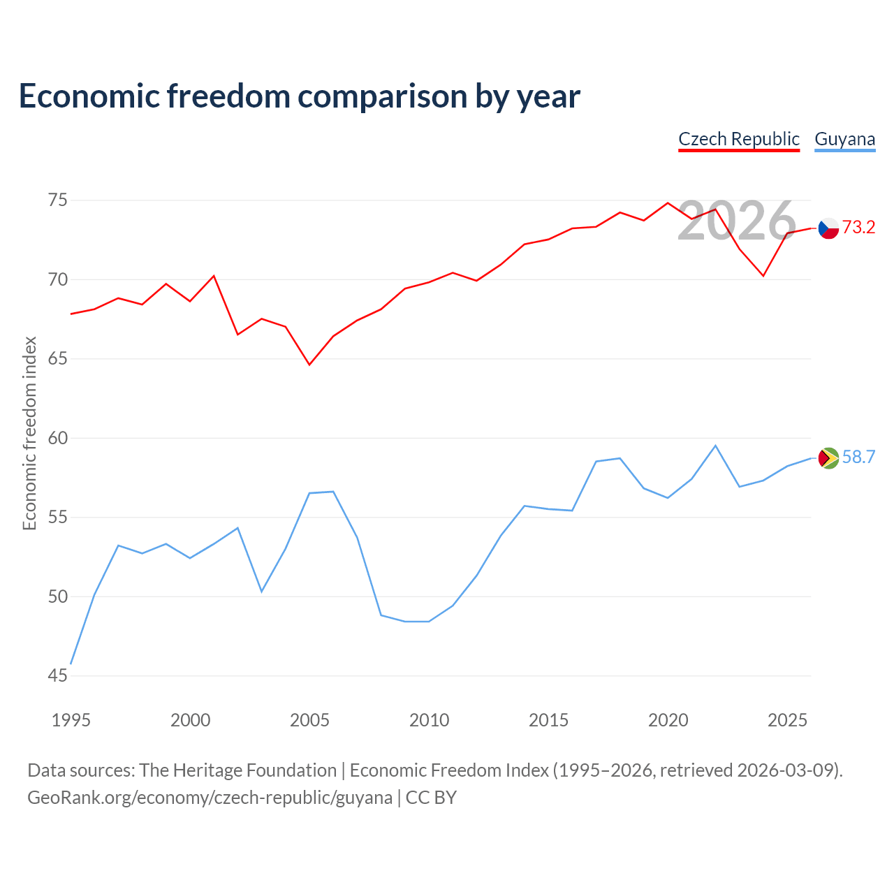 The Economic Freedom Index for the Czech Republic is 73.2, ranking 25/197, compared to 58.7 for Guyana, ranking 109/197. The chart above displays a comparison of annual changes in economic freedom indexes.