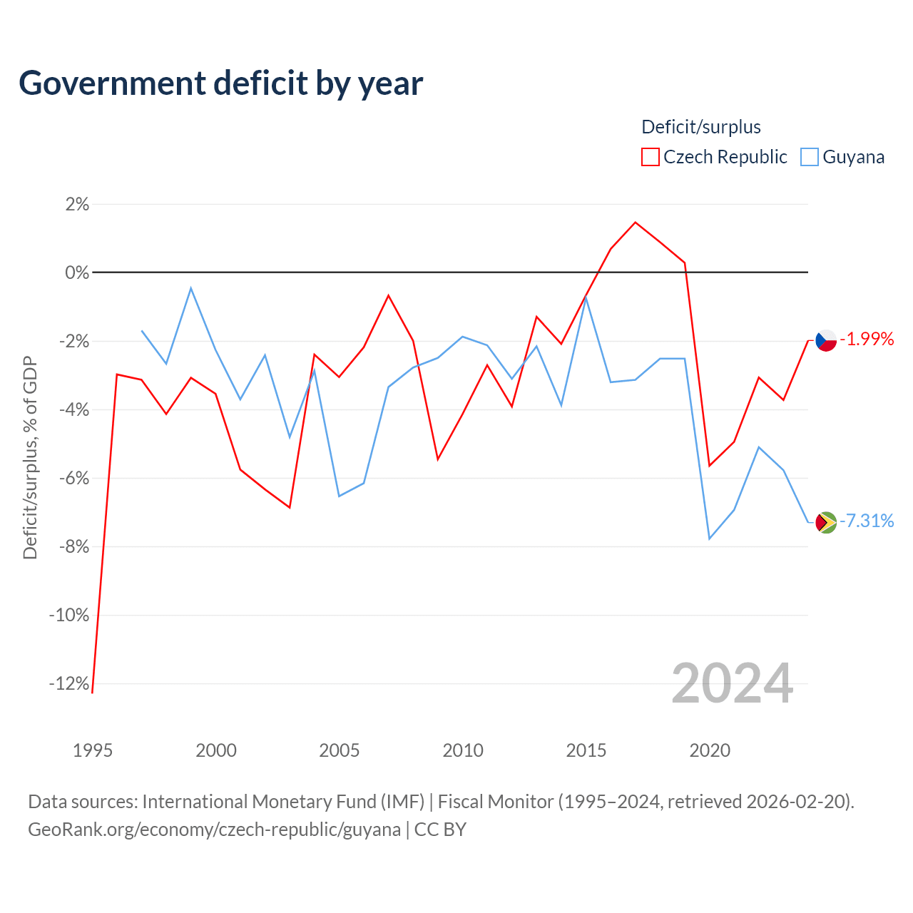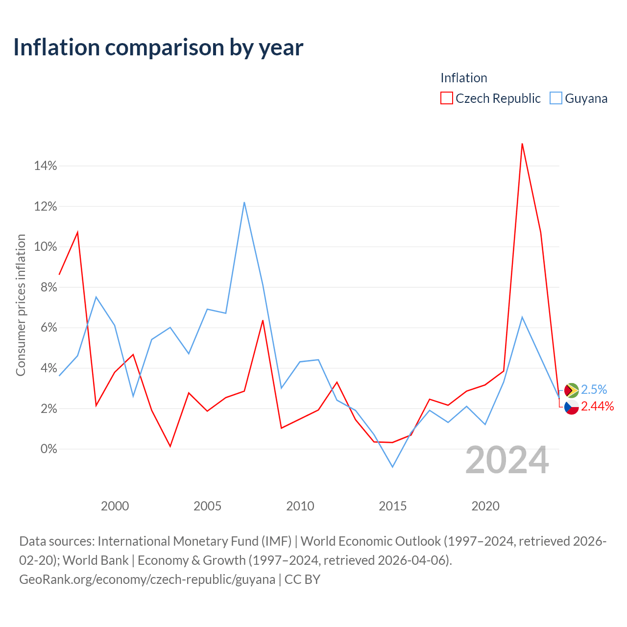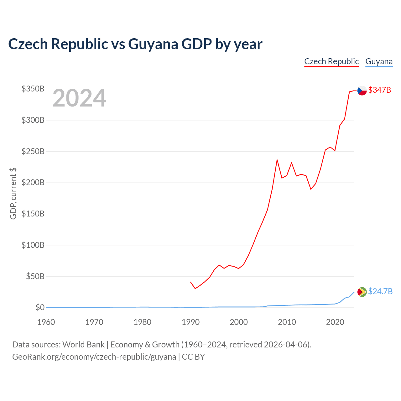 The Czech Republic has a GDP of $347B compared to $24.7B for Guyana, ranking 44/197 and 120/197 by economy size, respectively.