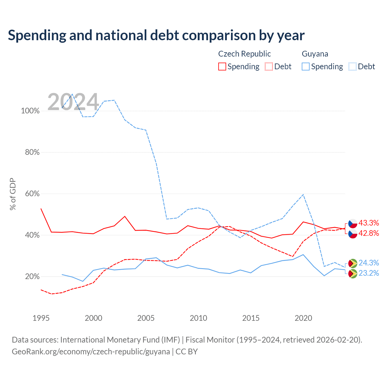 The Czech Republic has $150B in government debt (43.3% of GDP), compared to $5.99B (24.3% of GDP) in Guyana.