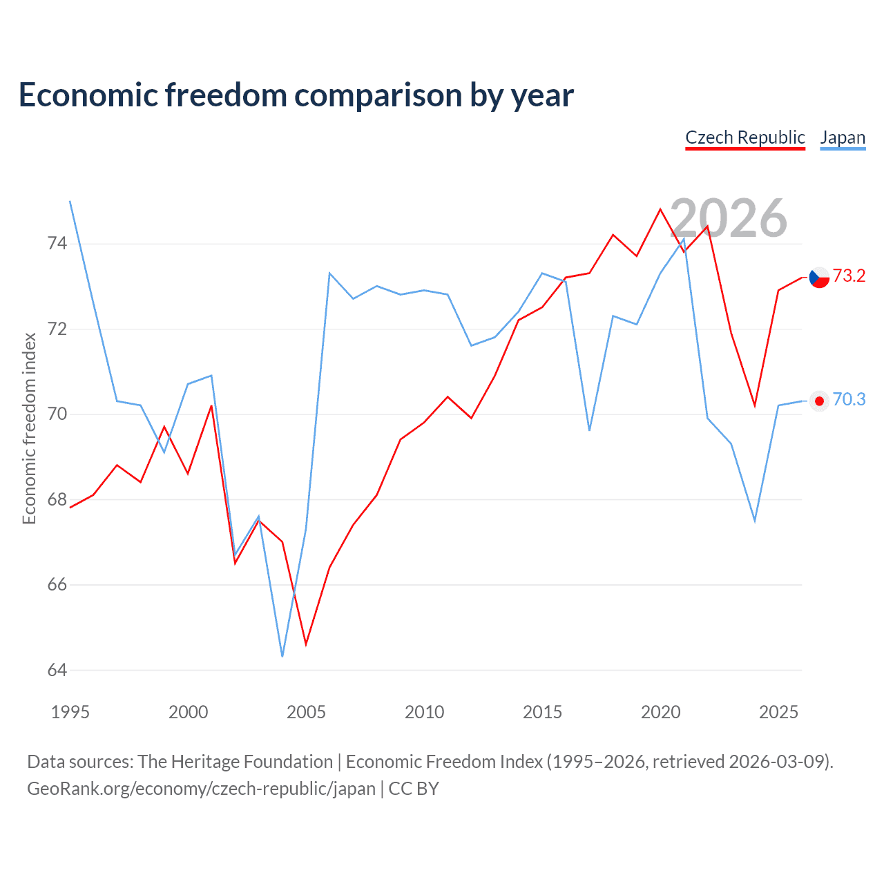 The Economic Freedom Index for the Czech Republic is 73.2, ranking 25/197, compared to 70.3 for Japan, ranking 36/197. The chart above displays a comparison of annual changes in economic freedom indexes.