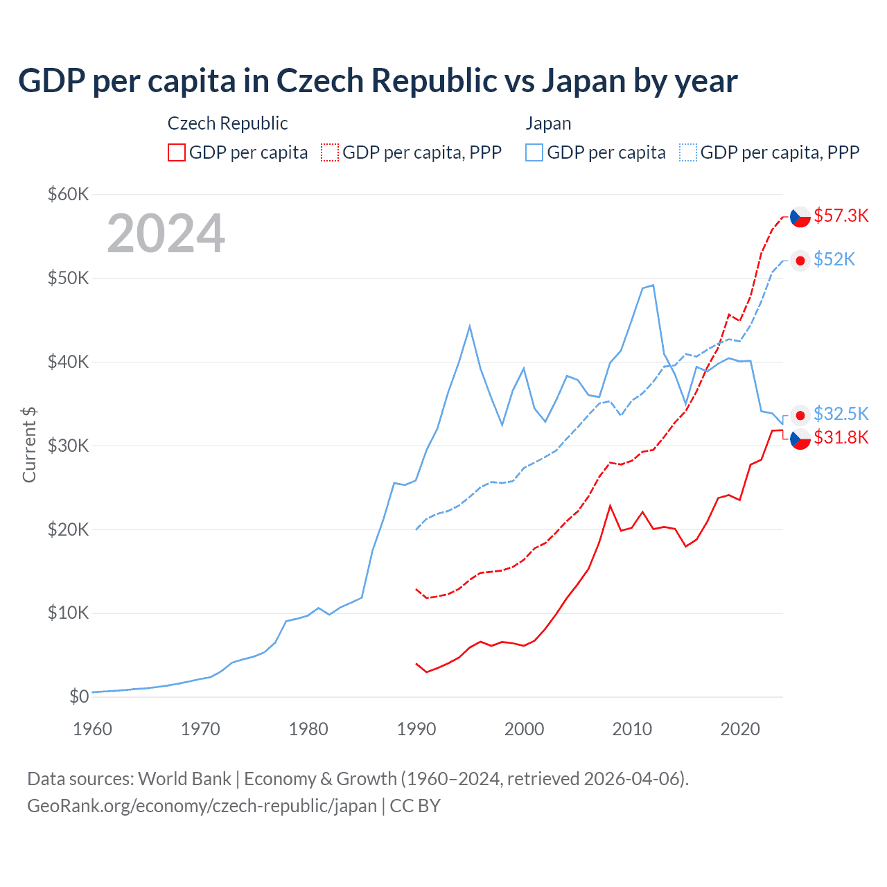 GDP per capita in Czech Republic vs Japan by year