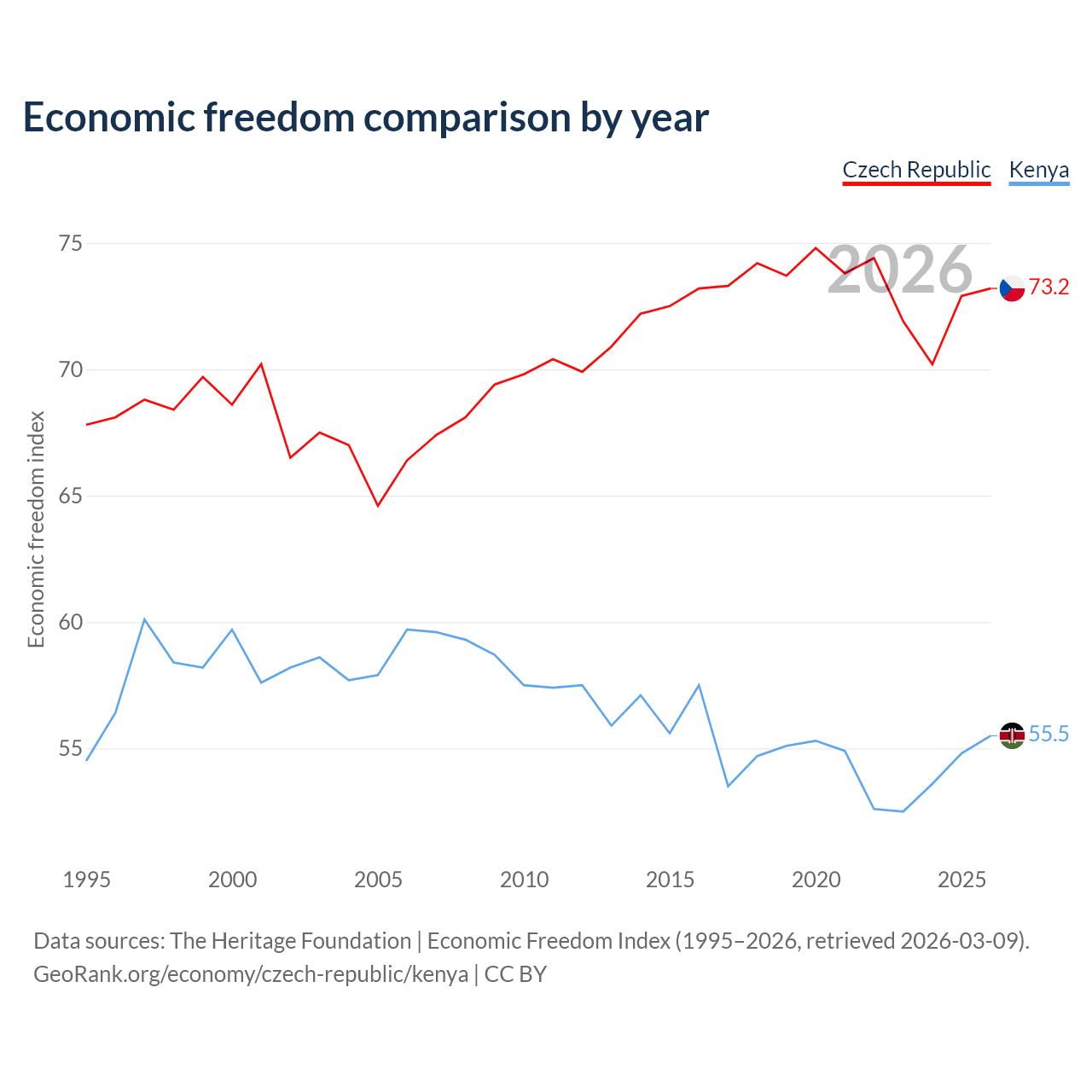 The Economic Freedom Index for the Czech Republic is 73.2, ranking 25/197, compared to 55.5 for Kenya, ranking 128/197. The chart above displays a comparison of annual changes in economic freedom indexes.