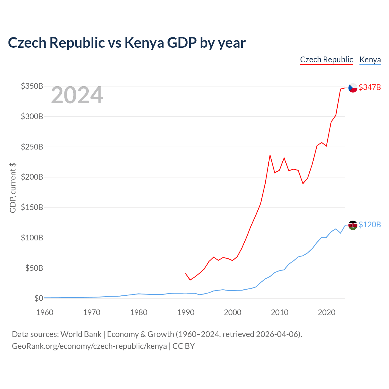 The Czech Republic has a GDP of $347B compared to $120B for Kenya, ranking 44/197 and 64/197 by economy size, respectively.