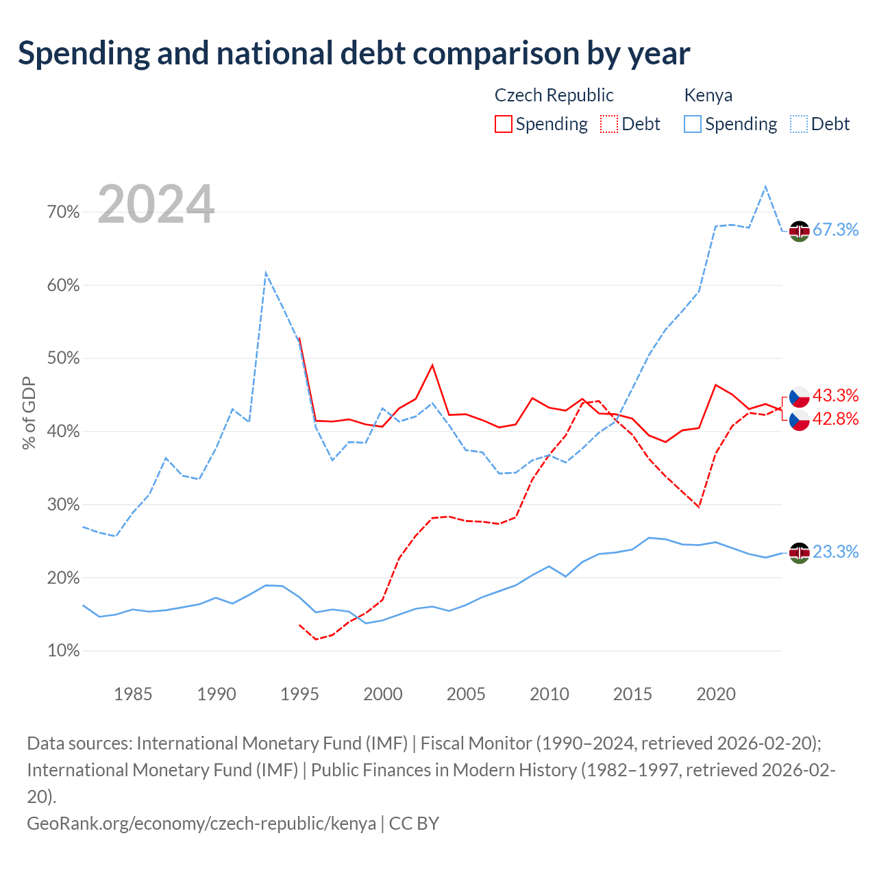 The Czech Republic has $150B in government debt (43.3% of GDP), compared to $81B (67.3% of GDP) in Kenya.