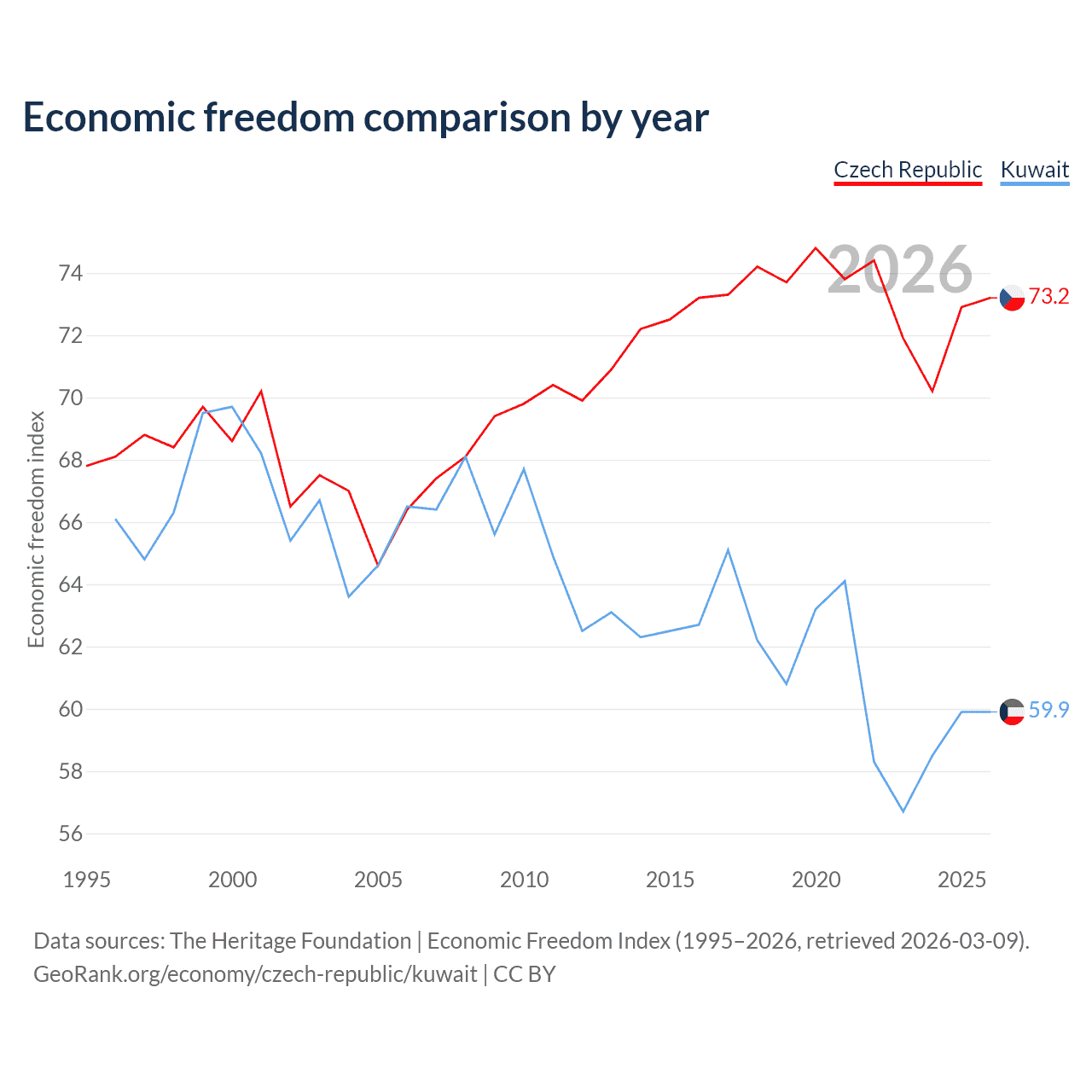 The Economic Freedom Index for the Czech Republic is 73.2, ranking 25/197, compared to 59.9 for Kuwait, ranking 100/197. The chart above displays a comparison of annual changes in economic freedom indexes.