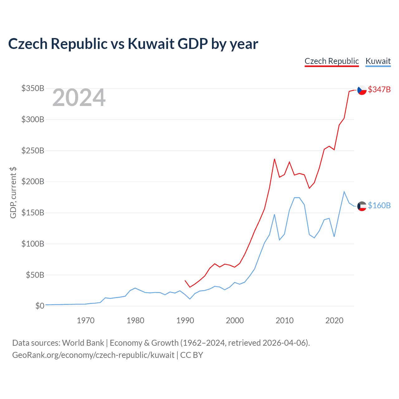 The Czech Republic has a GDP of $347B compared to $160B for Kuwait, ranking 44/197 and 59/197 by economy size, respectively.
