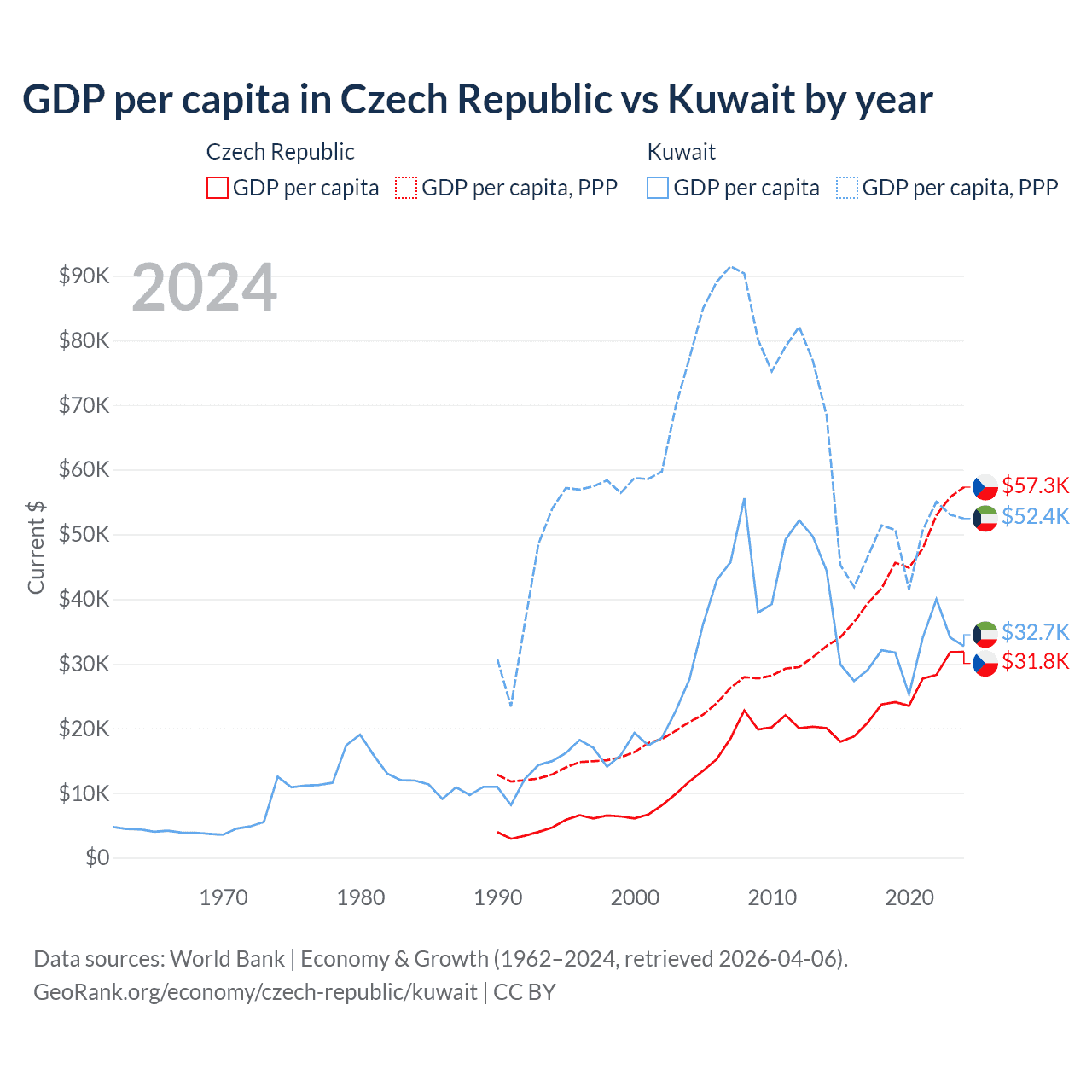GDP per capita in Czech Republic vs Kuwait by year