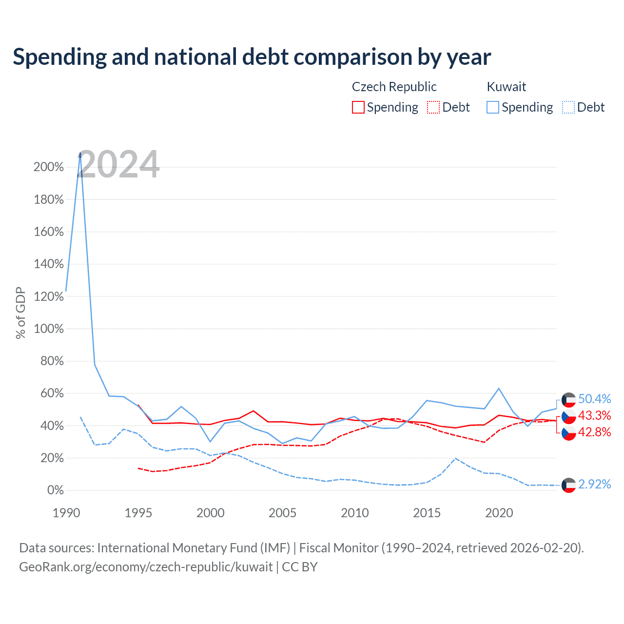 The Czech Republic has $150B in government debt (43.3% of GDP), compared to $4.68B (2.92% of GDP) in Kuwait.