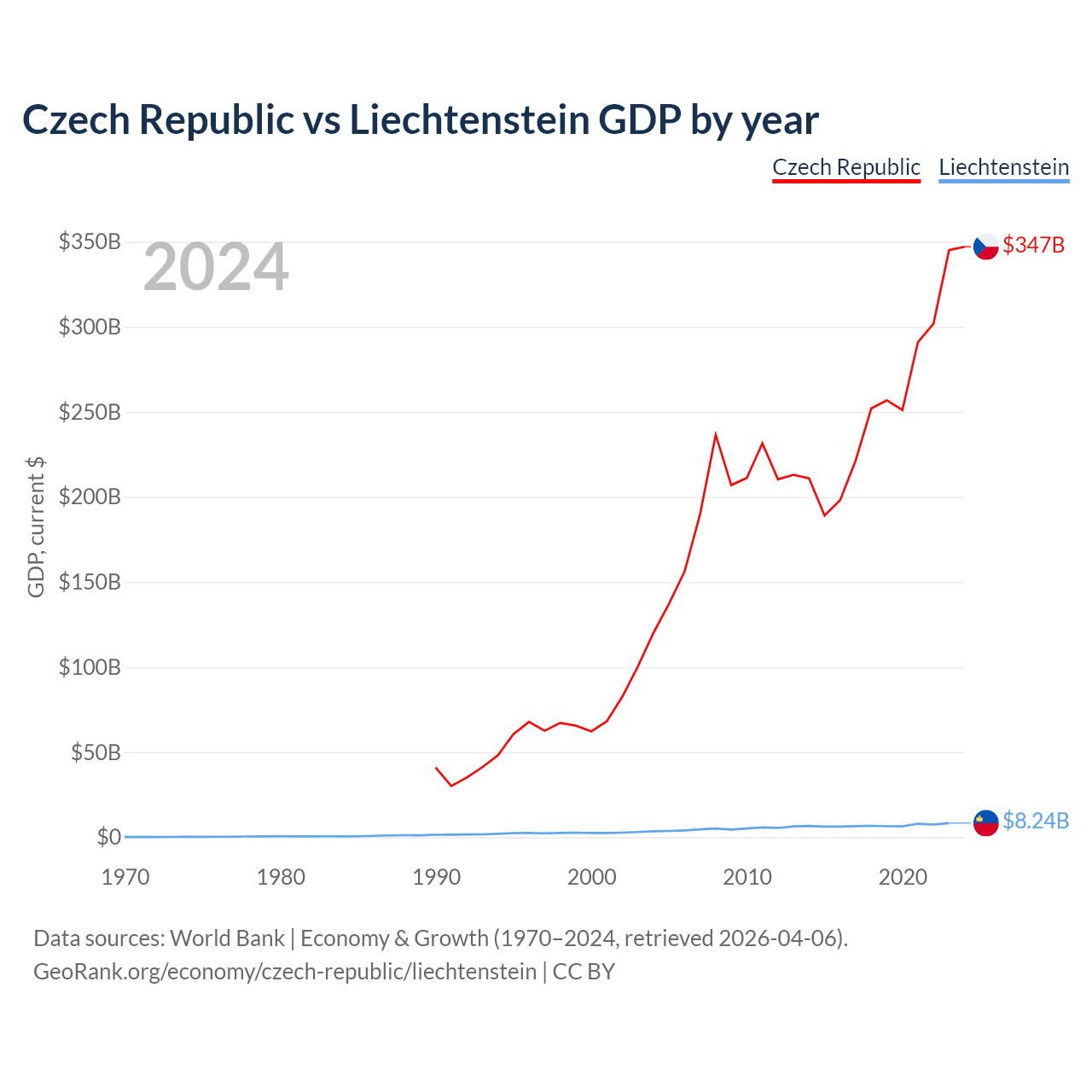 The Czech Republic has a GDP of $347B compared to $8.24B for Liechtenstein, ranking 44/197 and 156/197 by economy size, respectively.