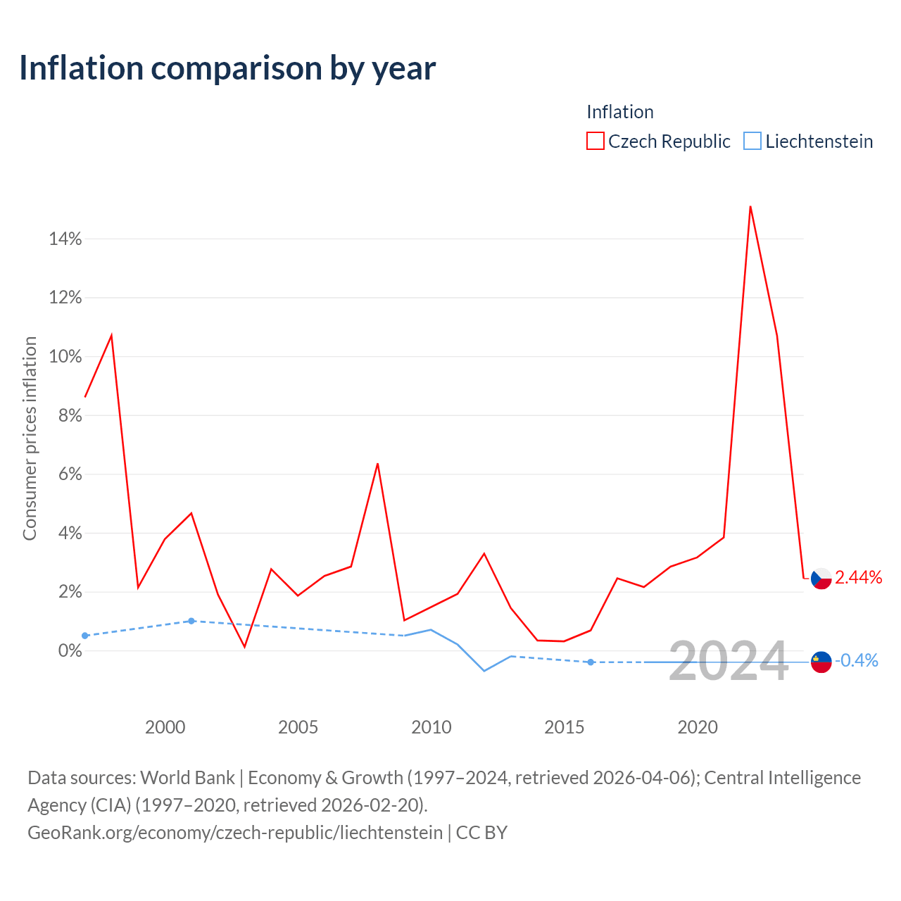 Over the past 24 years, the Czech Republic has recorded an average annual inflation rate of 2.89%, compared with 0.04% in Liechtenstein. In 2020, inflation was 2.44% in the Czech Republic and -0.4% in Liechtenstein.