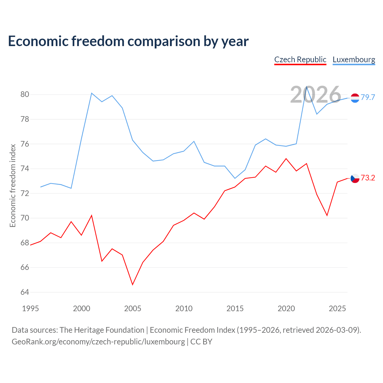 The Economic Freedom Index for the Czech Republic is 73.2, ranking 25/197, compared to 79.7 for Luxembourg, ranking 7/197. The chart above displays a comparison of annual changes in economic freedom indexes.