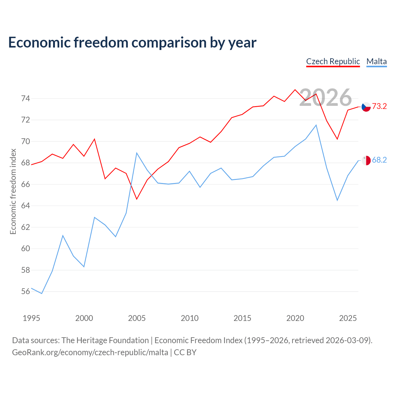 The Economic Freedom Index for the Czech Republic is 73.2, ranking 25/197, compared to 68.2 for Malta, ranking 49/197. The chart above displays a comparison of annual changes in economic freedom indexes.