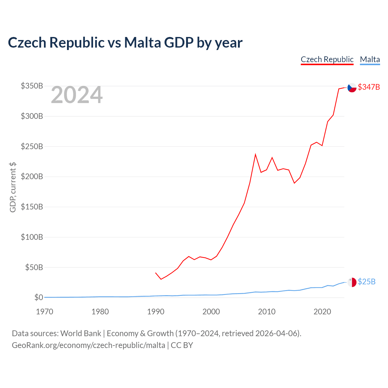 The Czech Republic has a GDP of $347B compared to $25B for Malta, ranking 44/197 and 119/197 by economy size, respectively.