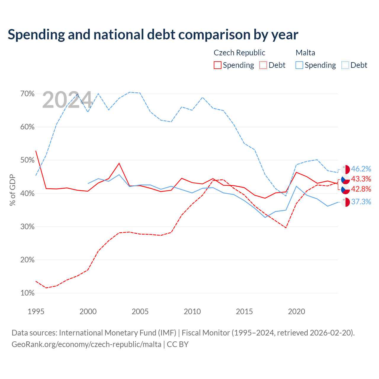 The Czech Republic has $150B in government debt (43.3% of GDP), compared to $11.5B (46.2% of GDP) in Malta.