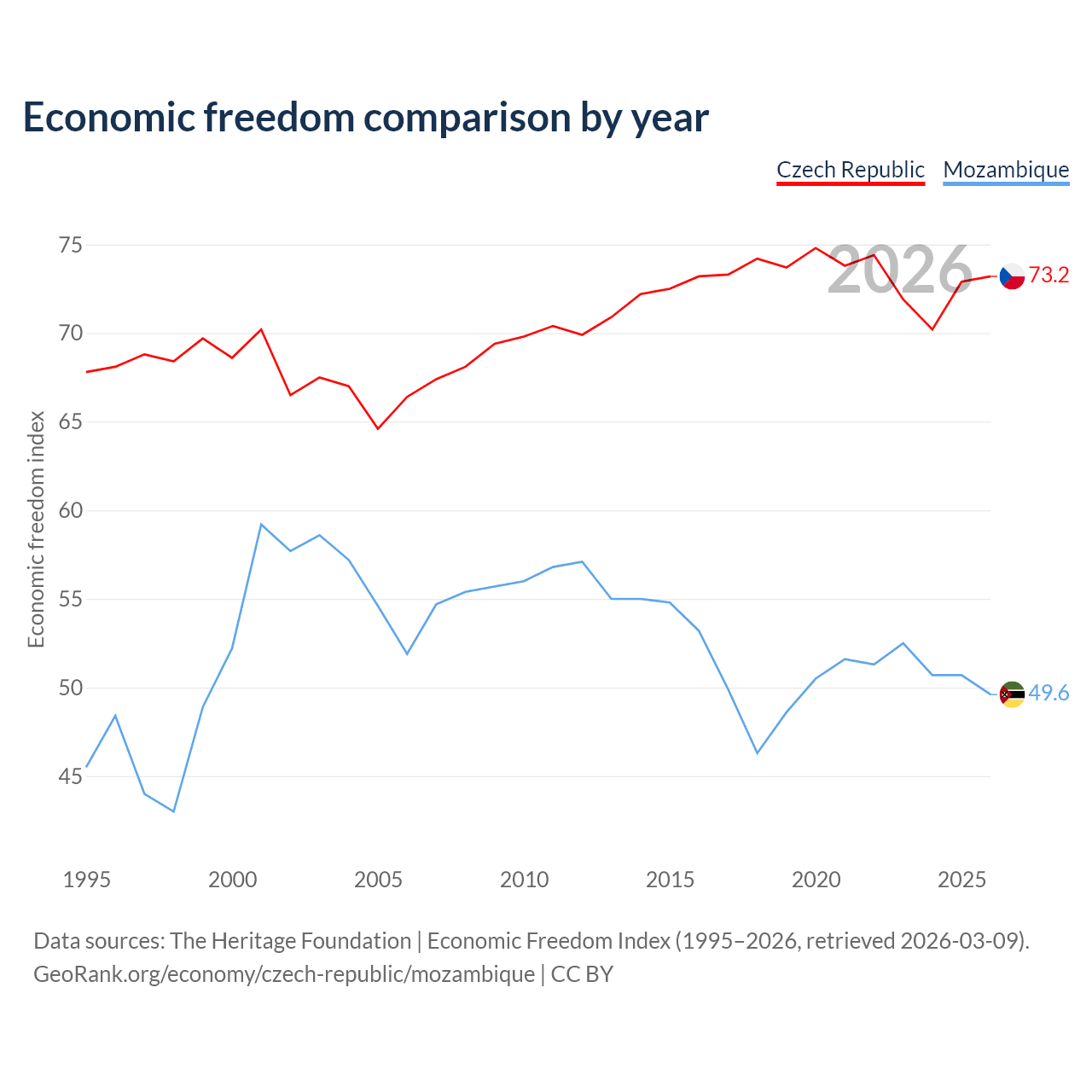 The Economic Freedom Index for the Czech Republic is 73.2, ranking 25/197, compared to 49.6 for Mozambique, ranking 164/197. The chart above displays a comparison of annual changes in economic freedom indexes.