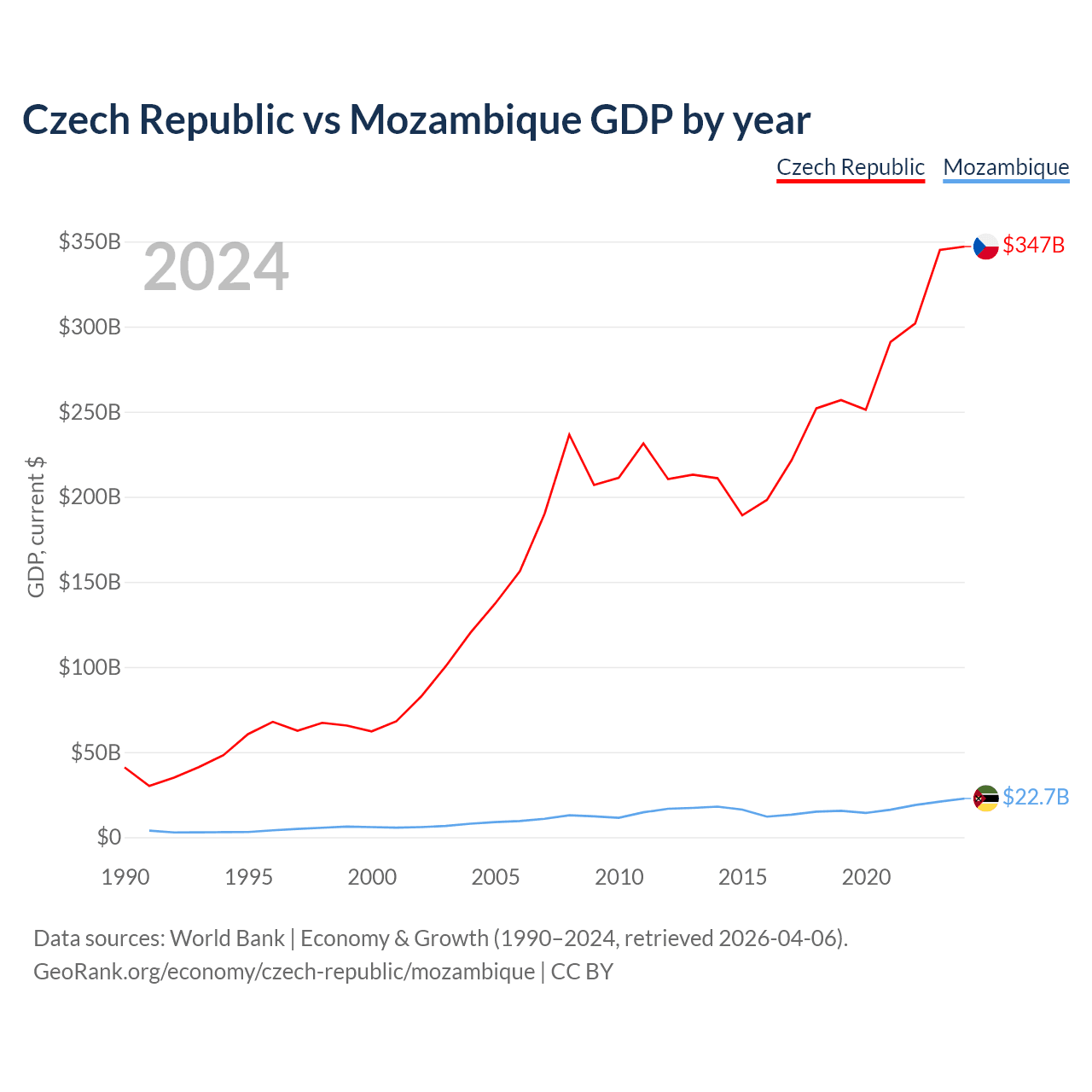 The Czech Republic has a GDP of $347B compared to $22.7B for Mozambique, ranking 44/197 and 123/197 by economy size, respectively.