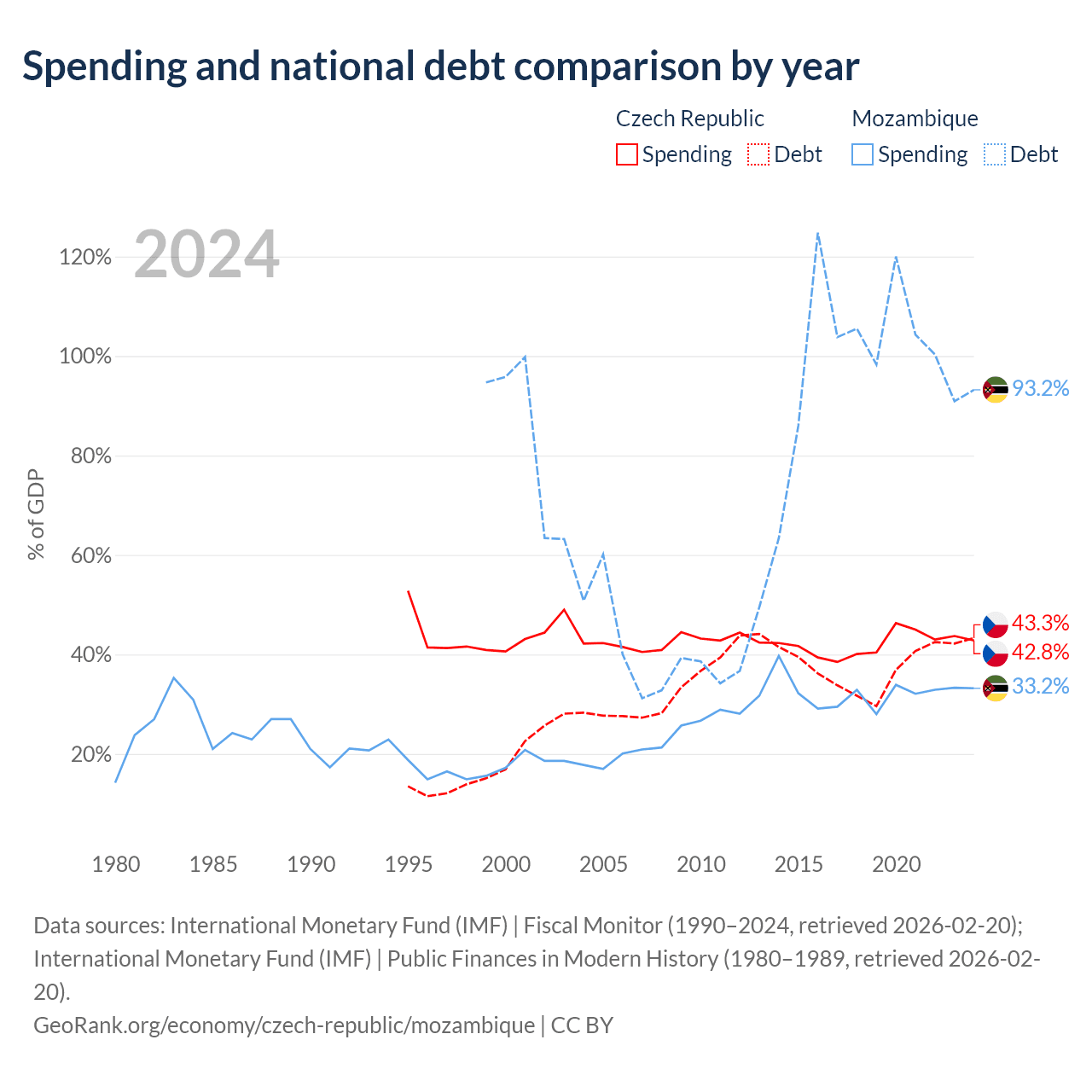 The Czech Republic has $150B in government debt (43.3% of GDP), compared to $21.2B (93.2% of GDP) in Mozambique.