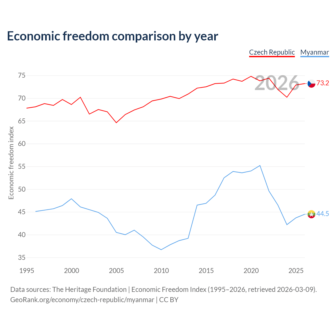 The Economic Freedom Index for the Czech Republic is 73.2, ranking 25/197, compared to 44.5 for Myanmar, ranking 180/197. The chart above displays a comparison of annual changes in economic freedom indexes.