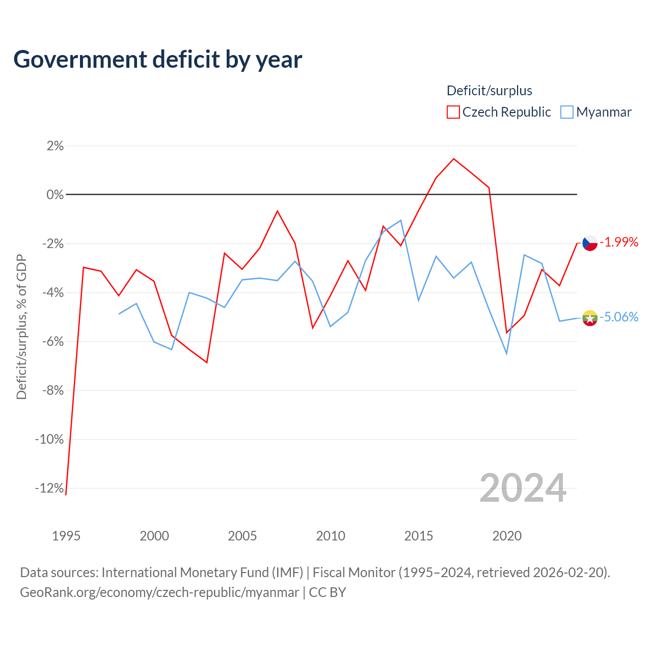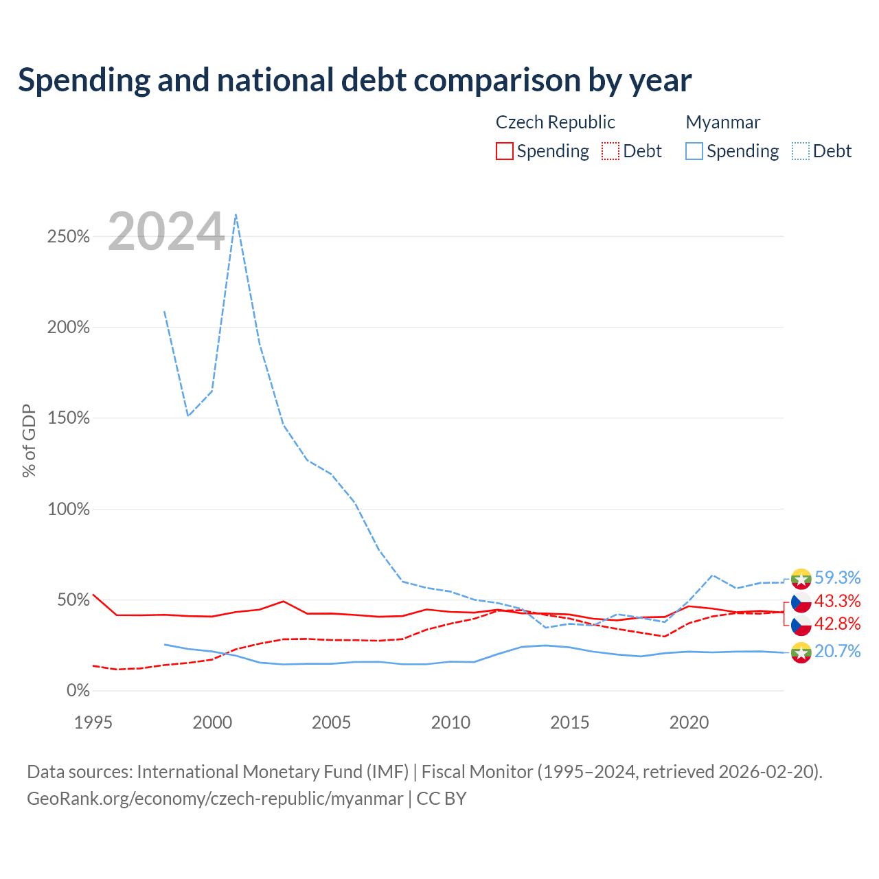 The Czech Republic has $150B in government debt (43.3% of GDP), compared to $44B (59.3% of GDP) in Myanmar.