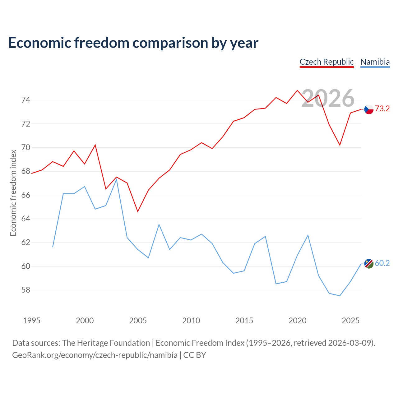 The Economic Freedom Index for the Czech Republic is 73.2, ranking 25/197, compared to 60.2 for Namibia, ranking 95/197. The chart above displays a comparison of annual changes in economic freedom indexes.