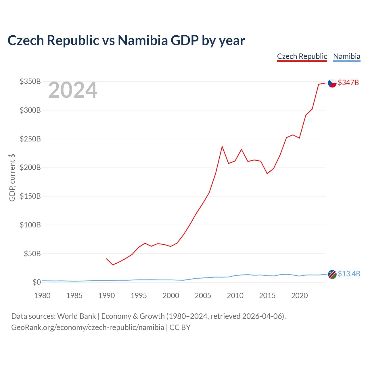 The Czech Republic has a GDP of $347B compared to $13.4B for Namibia, ranking 44/197 and 147/197 by economy size, respectively.