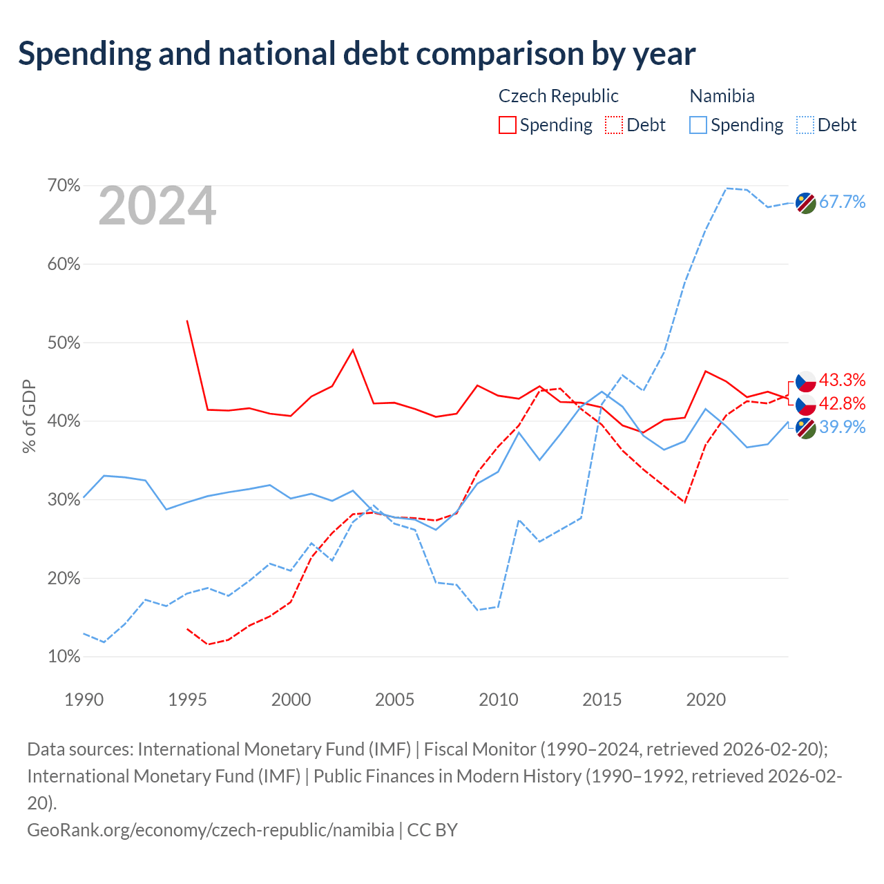 The Czech Republic has $150B in government debt (43.3% of GDP), compared to $9.05B (67.7% of GDP) in Namibia.