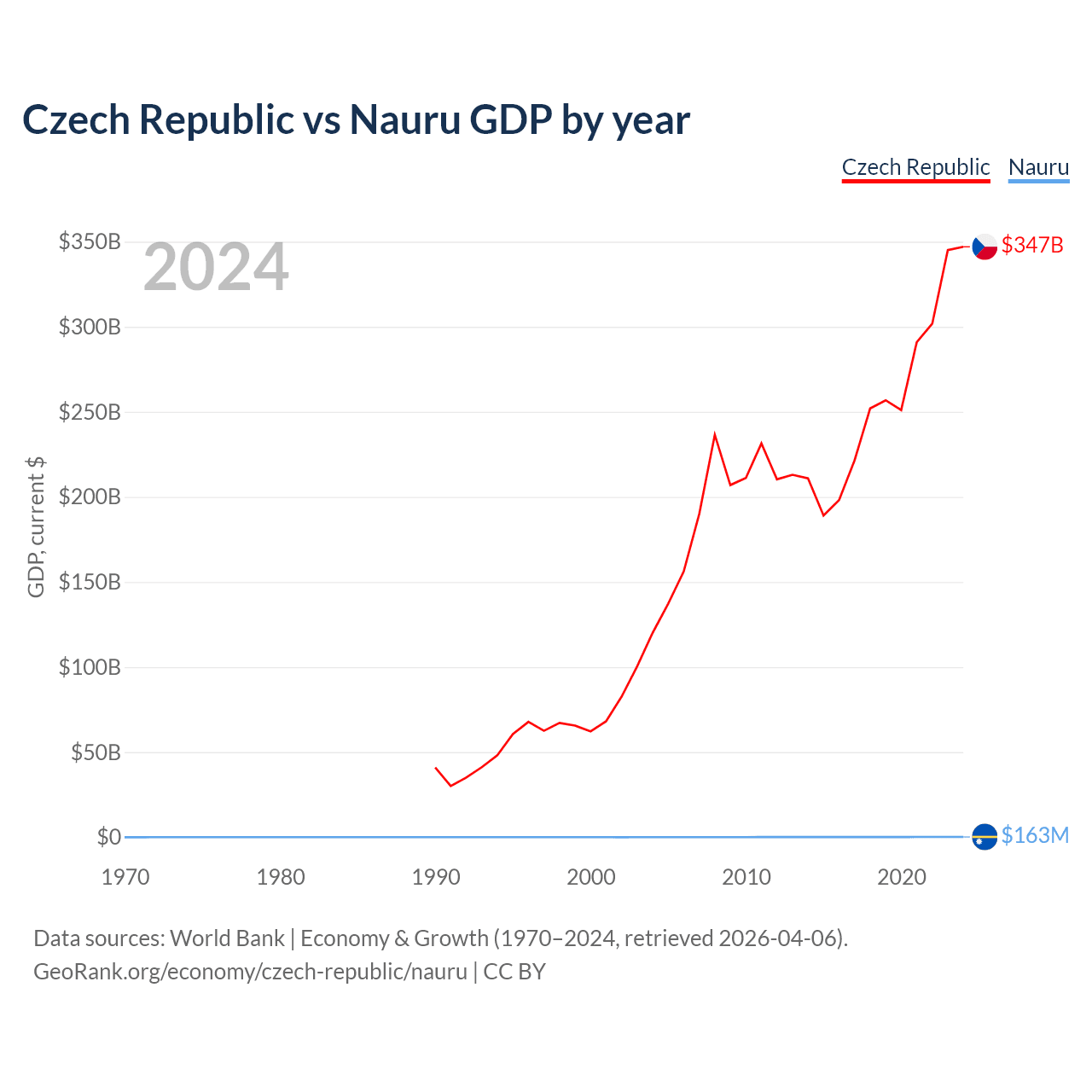 The Czech Republic has a GDP of $347B compared to $163M for Nauru, ranking 44/197 and 195/197 by economy size, respectively.