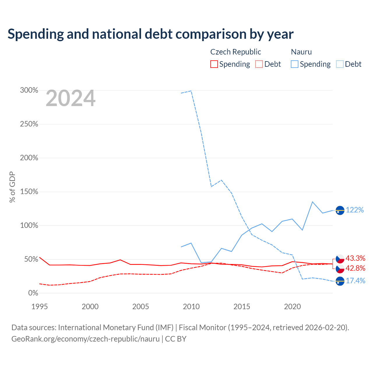 The Czech Republic has $150B in government debt (43.3% of GDP), compared to $28.3M (17.4% of GDP) in Nauru.