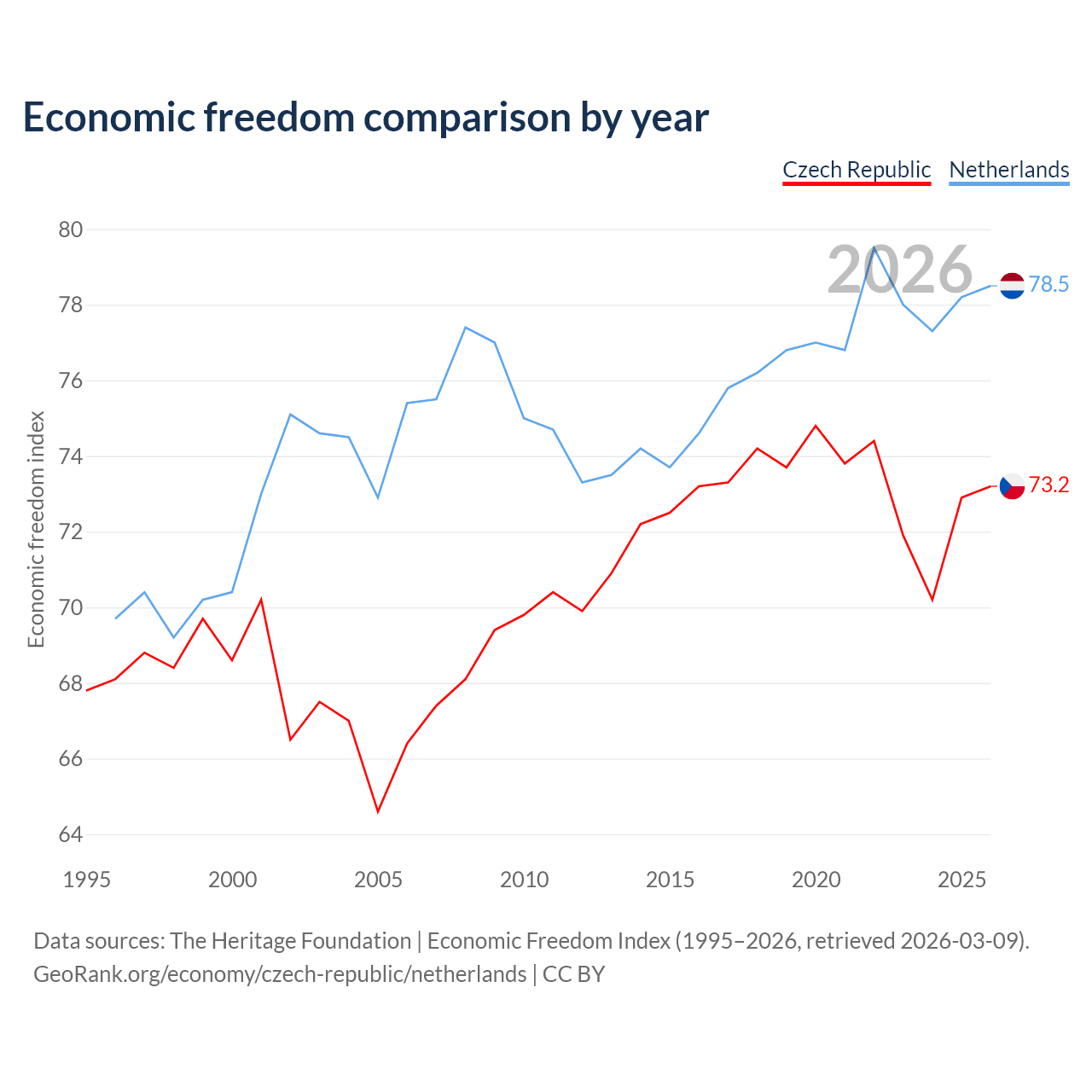 The Economic Freedom Index for the Czech Republic is 73.2, ranking 25/197, compared to 78.5 for the Netherlands, ranking 11/197. The chart above displays a comparison of annual changes in economic freedom indexes.