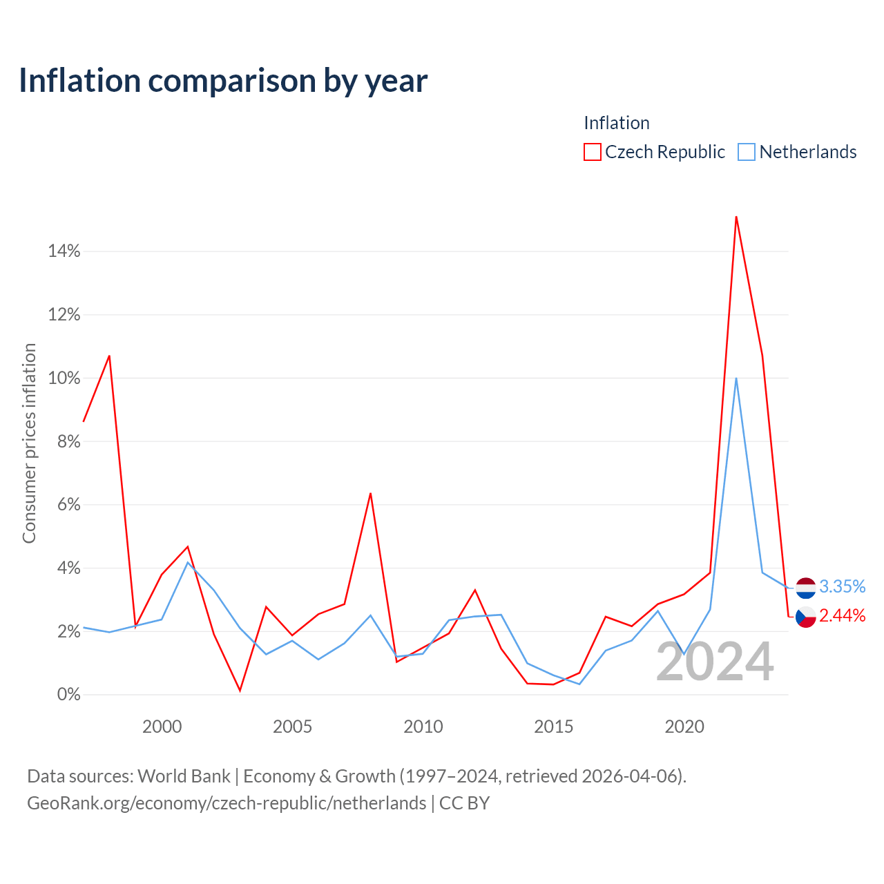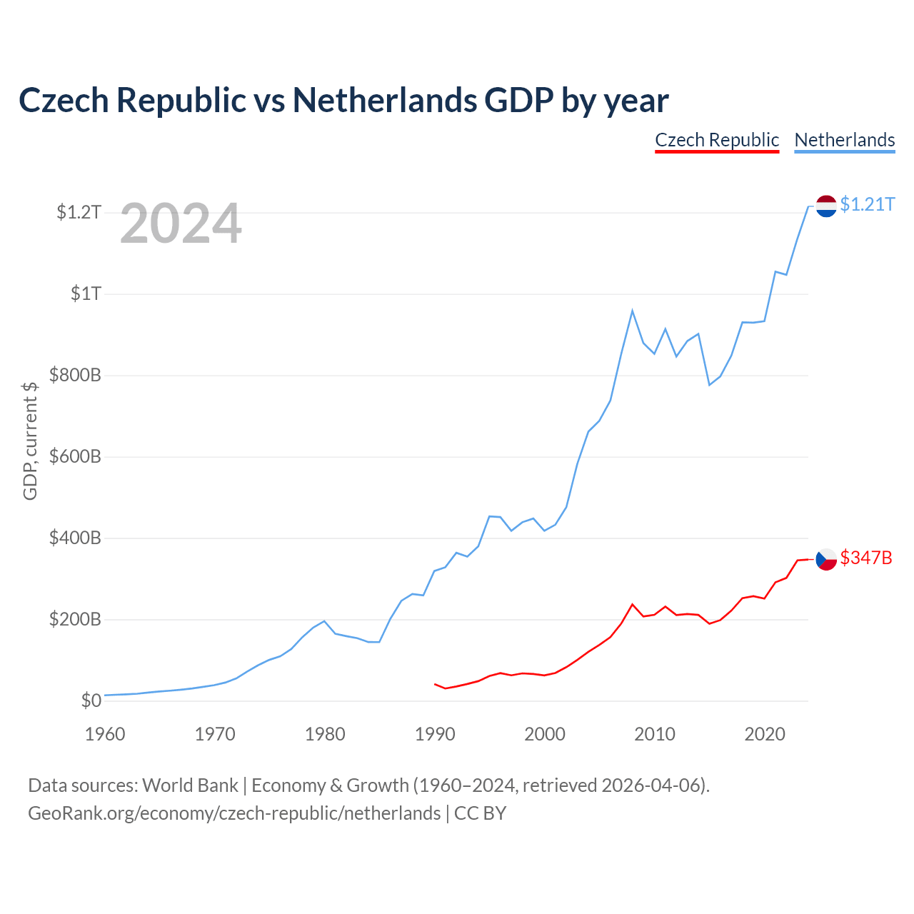 The Czech Republic has a GDP of $347B compared to $1.21T for the Netherlands, ranking 44/197 and 19/197 by economy size, respectively.