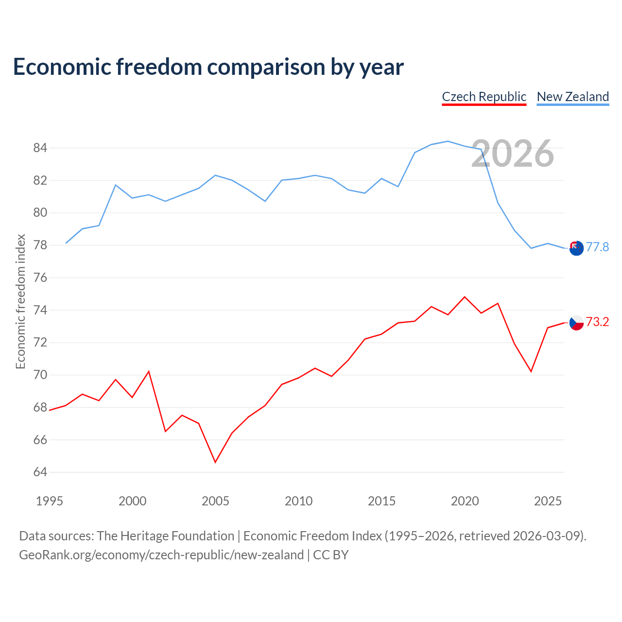 The Economic Freedom Index for the Czech Republic is 73.2, ranking 25/197, compared to 77.8 for New Zealand, ranking 13/197. The chart above displays a comparison of annual changes in economic freedom indexes.