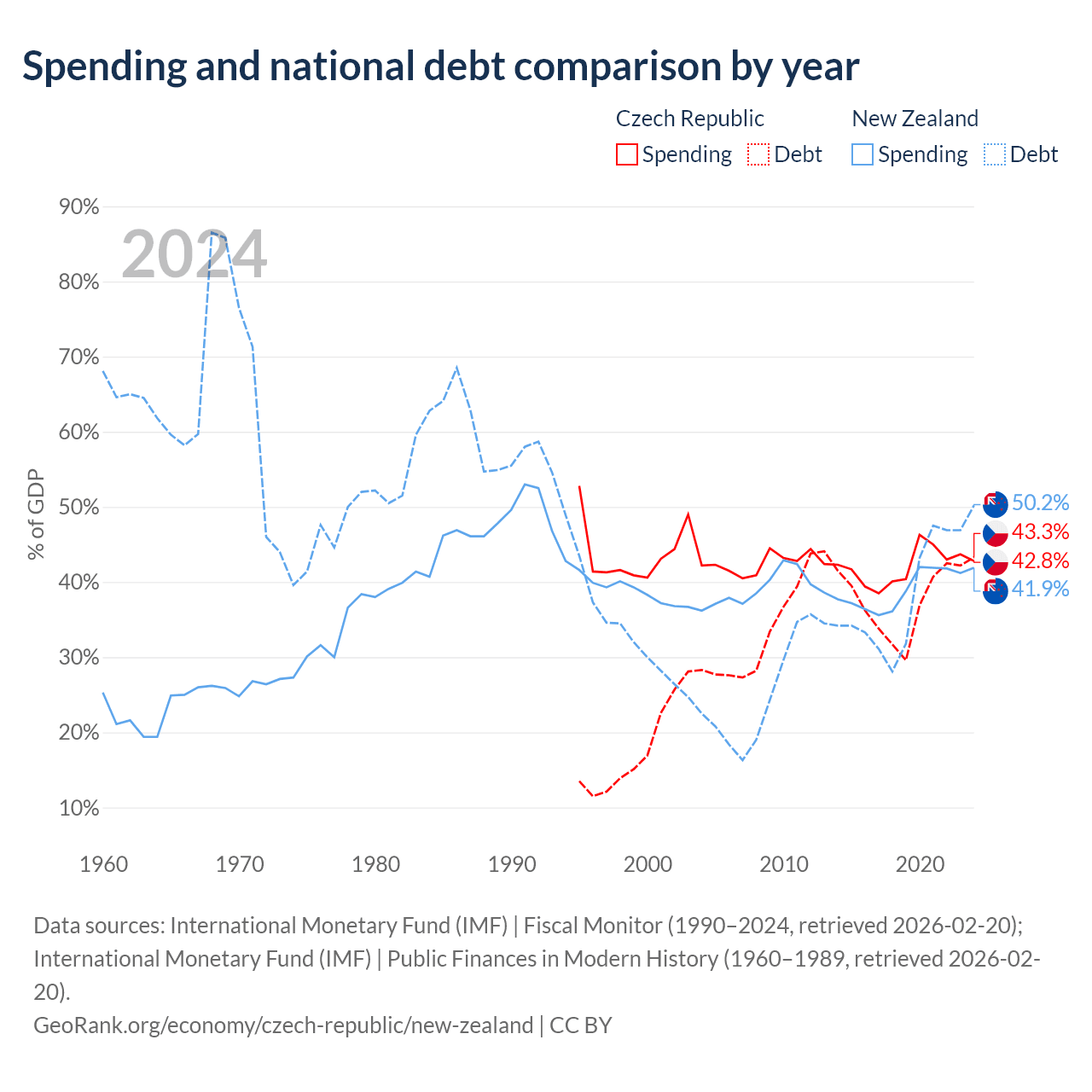 The Czech Republic has $150B in government debt (43.3% of GDP), compared to $131B (50.2% of GDP) in New Zealand.
