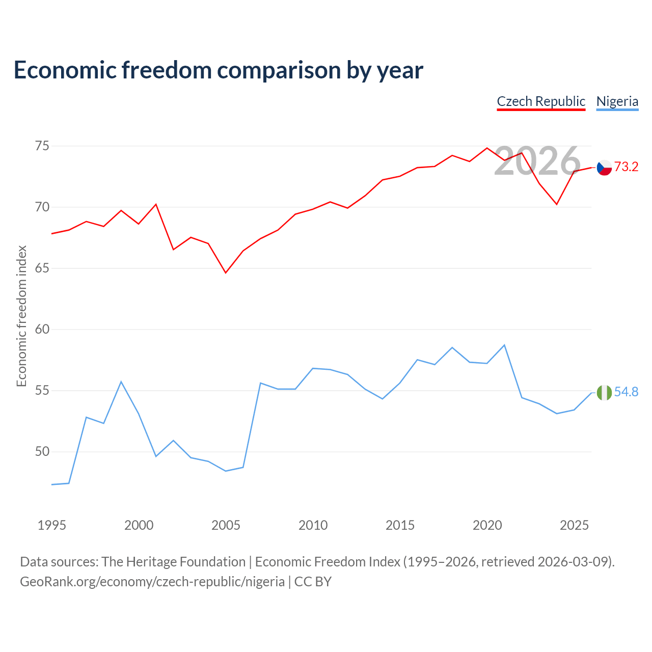 The Economic Freedom Index for the Czech Republic is 73.2, ranking 25/197, compared to 54.8 for Nigeria, ranking 132/197. The chart above displays a comparison of annual changes in economic freedom indexes.