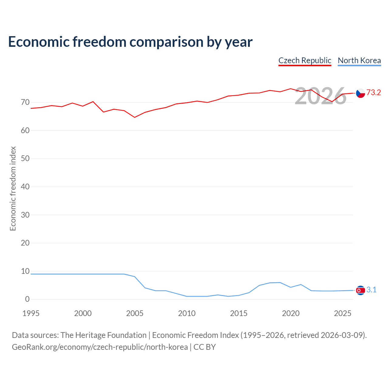 The Economic Freedom Index for the Czech Republic is 73.2, ranking 25/197, compared to 3.1 for North Korea, ranking 197/197. The chart above displays a comparison of annual changes in economic freedom indexes.